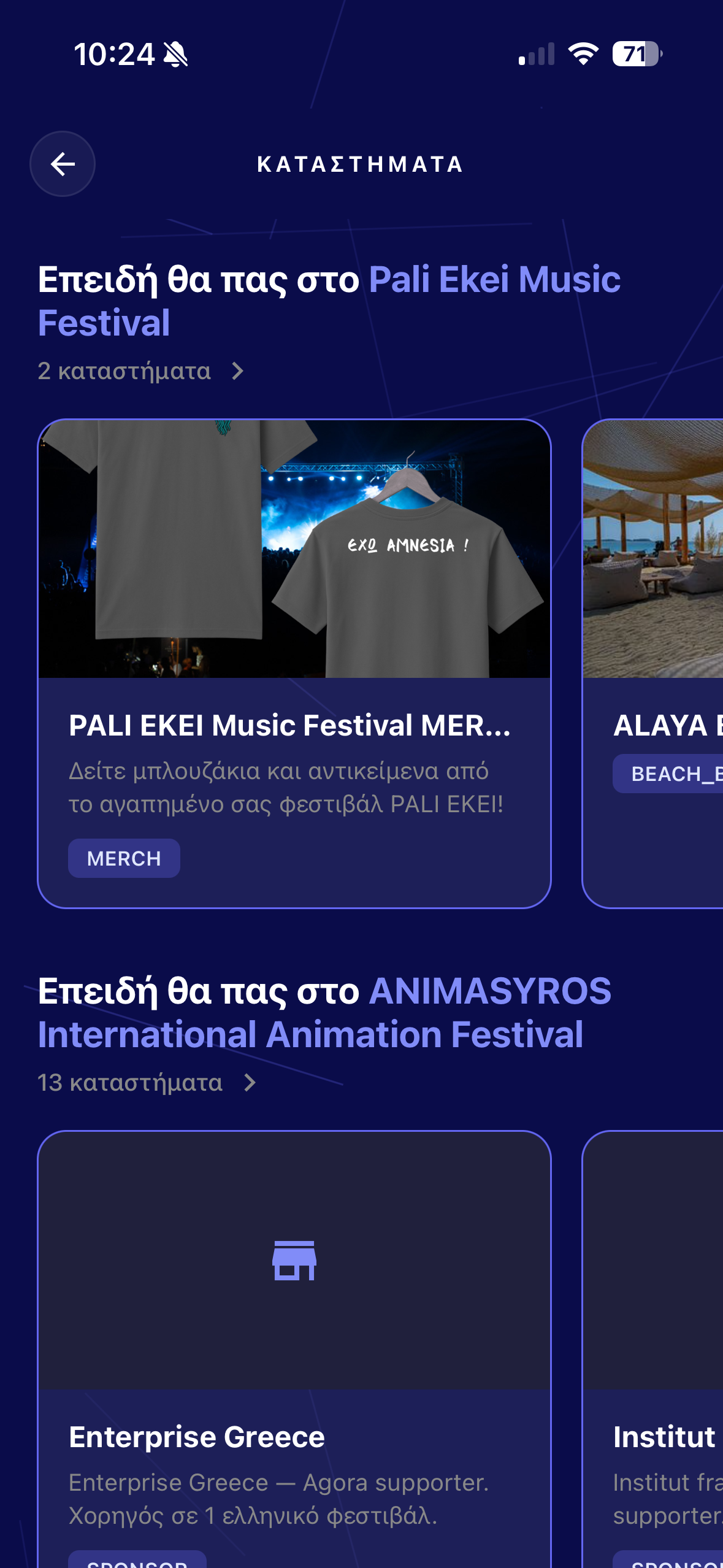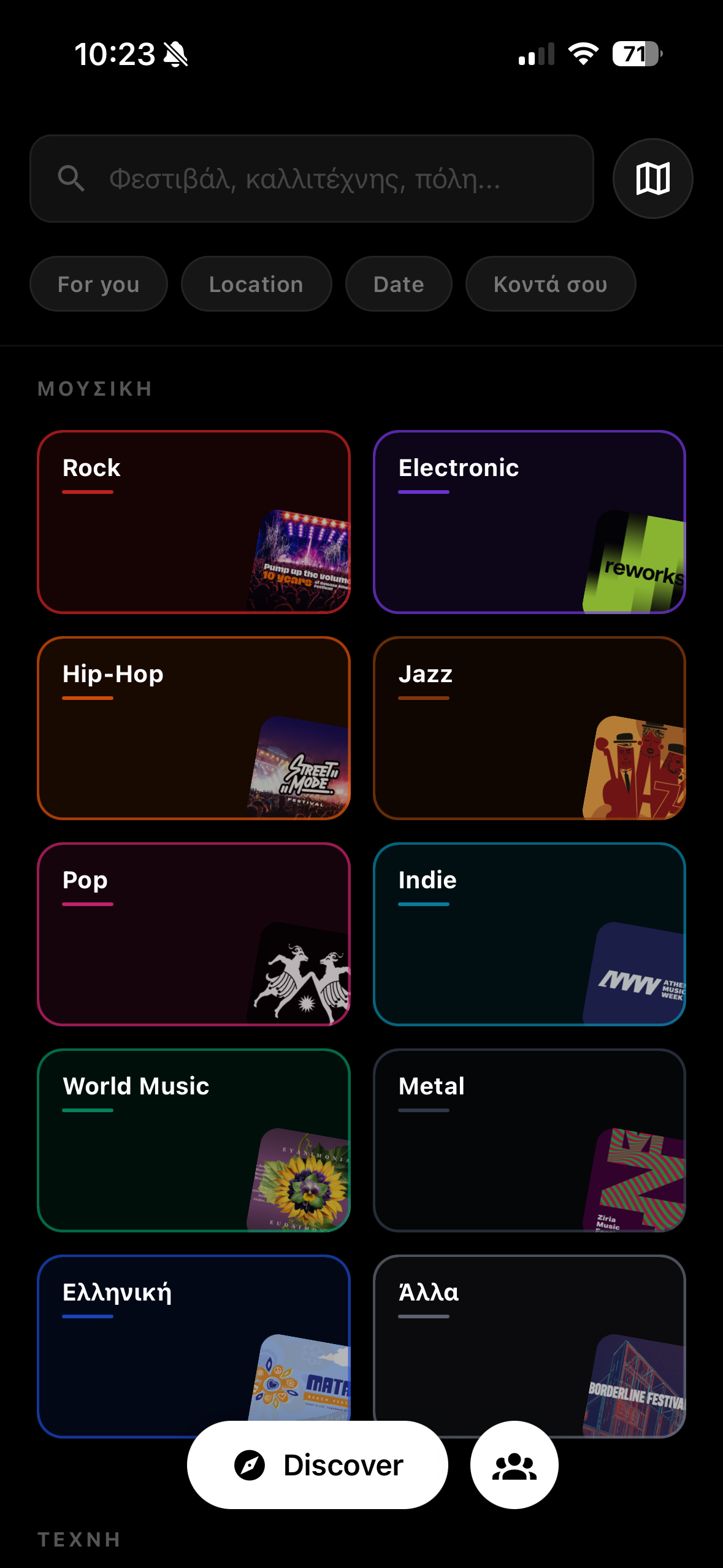Filter by genre, city or date — or just type whatever, even in greeklish. Smart suggestions, QR scanner included.